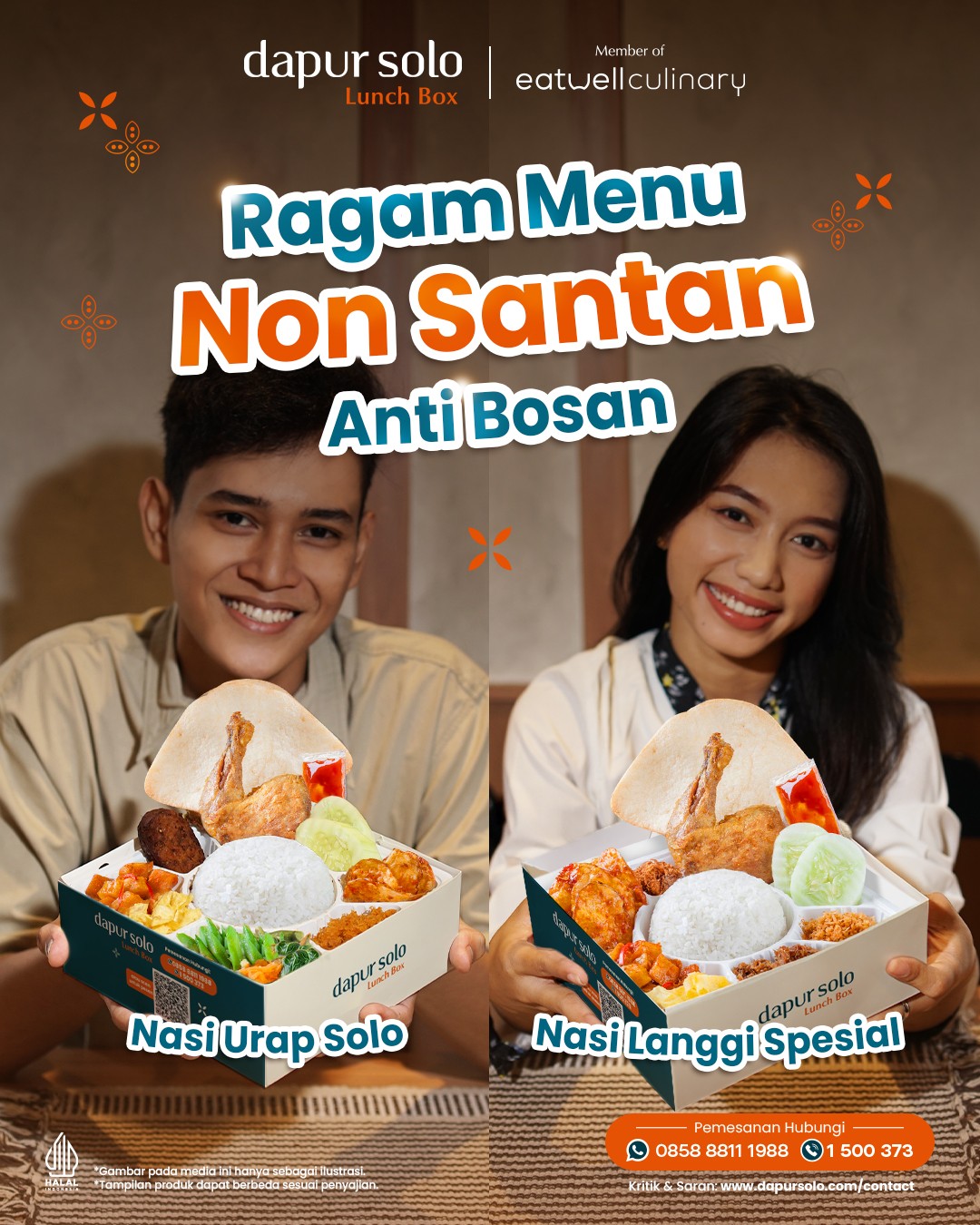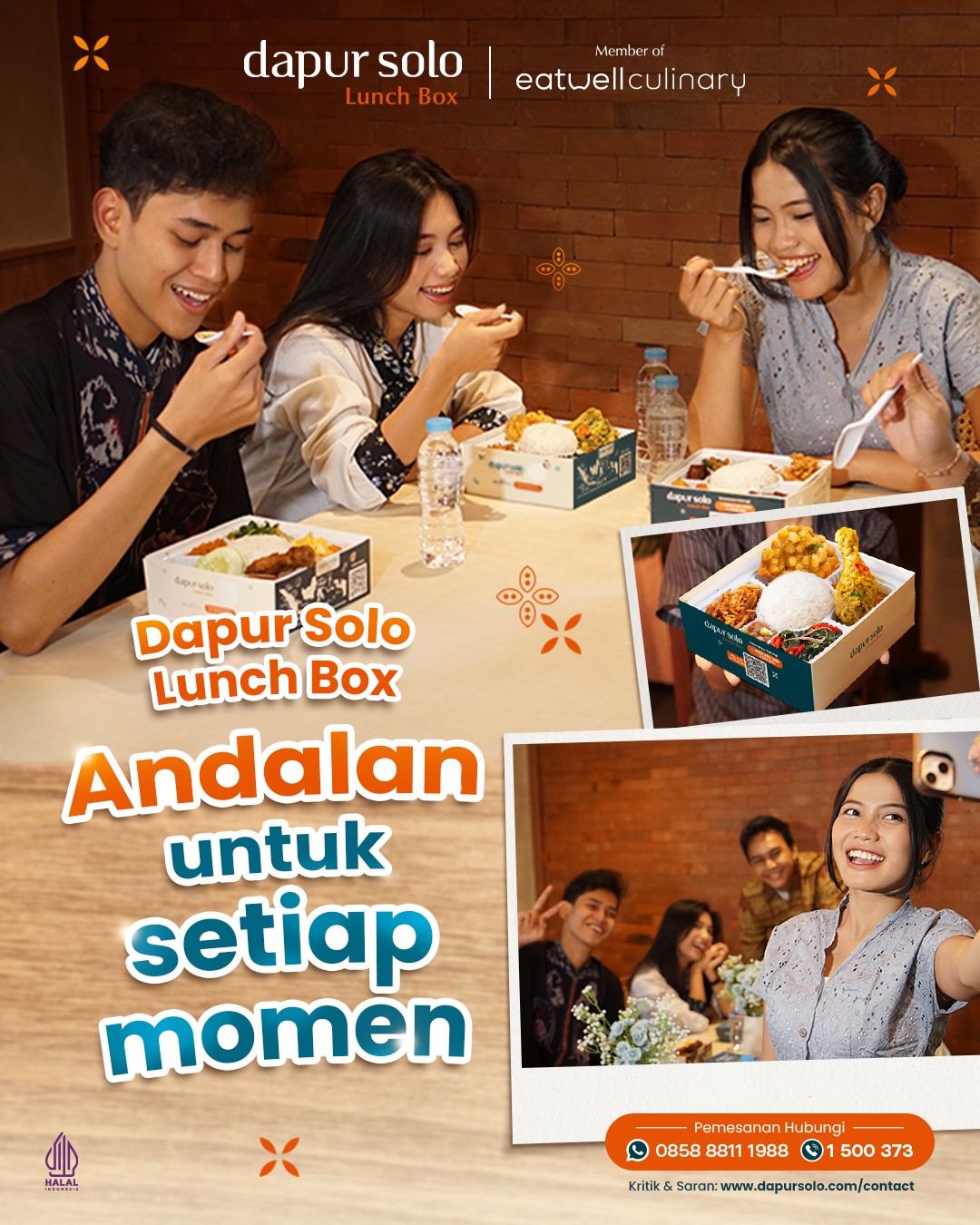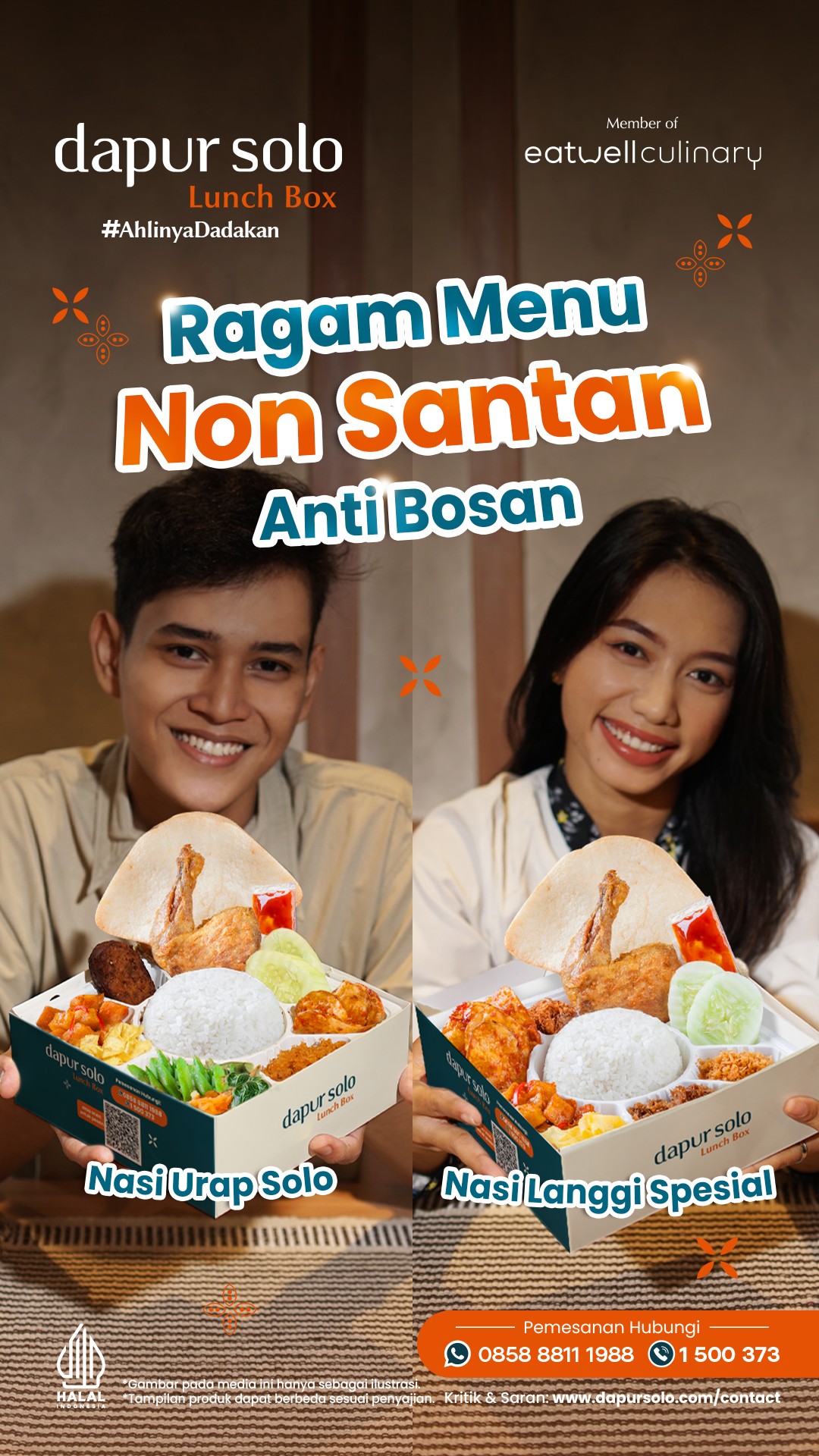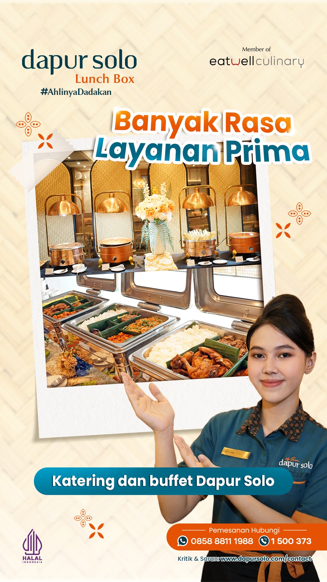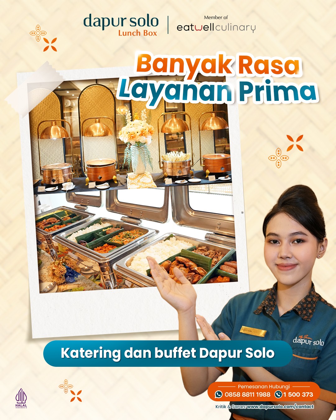 Dari acara besar hingga konsumsi meeting, banyak yang memilih katering Dapur Solo Lunch Box karena tahu: rasa autentik dan pelayanan cepat adalah komitmen kami sejak 1988. Dengan harga mulai Rp22.000*, menu beragam, dan 13 cabang yang siap melayani pesanan REAL dadakan — Dapur Solo Lunch Box memastikan setiap hidangan tersaji dengan kualitas terbaik.