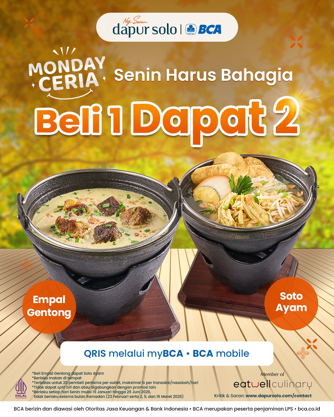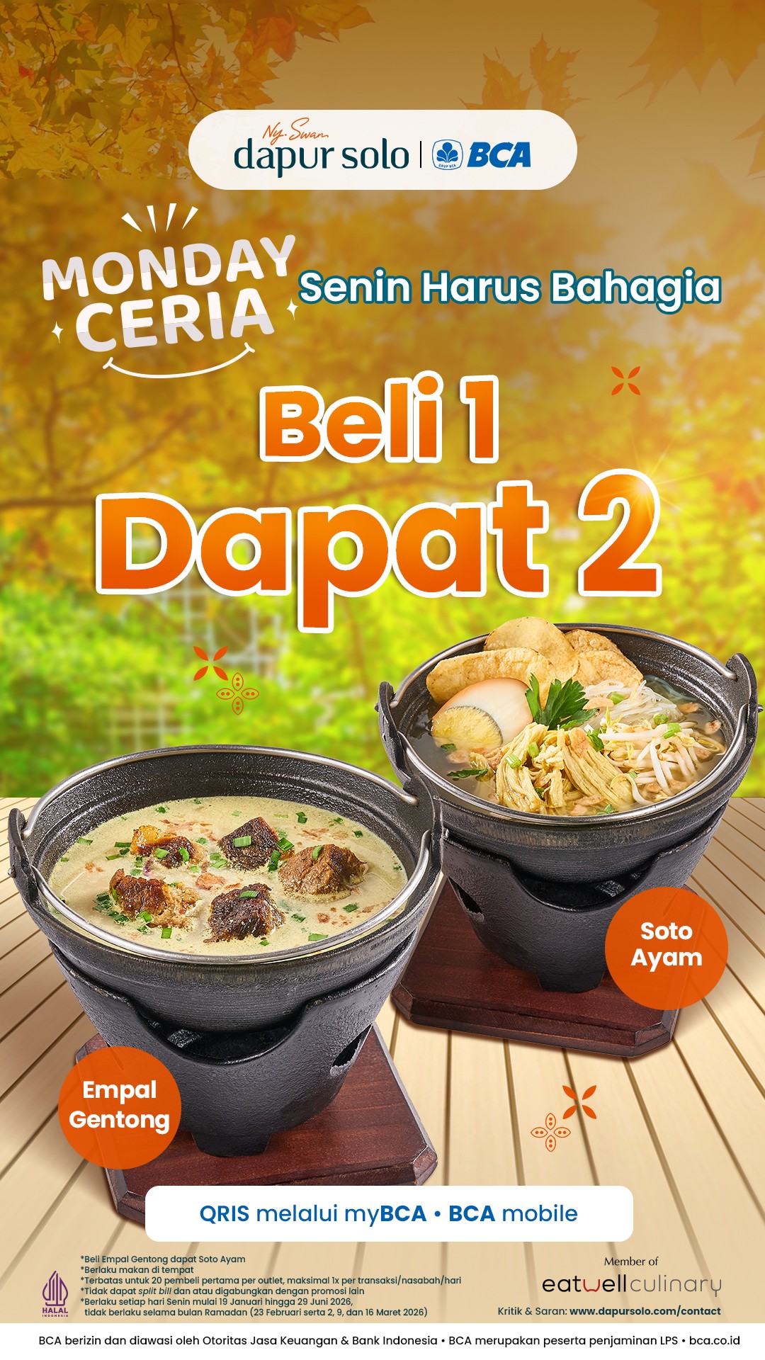 Musim hujan paling nikmat makan yang berkuah ya, Sahabat DS. Langsung mampir ke Dapur Solo untuk nikmati Empal Gentong yang GRATIS* Soto Ayam dengan pembayaran melalui QRIS BCA!