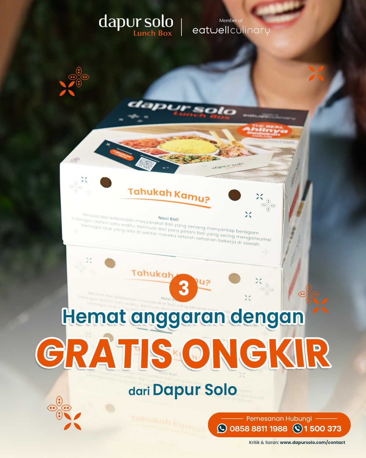 Dari acara besar hingga konsumsi meeting, banyak yang memilih katering Dapur Solo Lunch Box karena tahu: rasa autentik dan pelayanan cepat adalah komitmen kami sejak 1988. Dengan harga mulai Rp22.000*, menu beragam, dan 13 cabang yang siap melayani pesanan REAL dadakan — Dapur Solo Lunch Box memastikan setiap hidangan tersaji dengan kualitas terbaik.